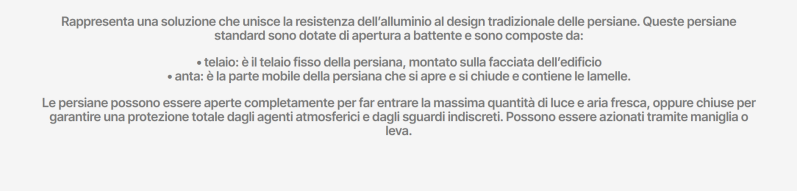 Le persiane Briller sono inoltre elementi di grande valore estetico che conferiscono prestigio alla facciata di un immobile. Sono integrabili, sia nella forma che nello stile, in qualsiasi esigenza architettonica: nuove costruzioni, ristrutturazioni o restauri conservativi. Possono essere realizzati in forme atipiche e irregolari: archi, trapezi, triangoli, ecc.